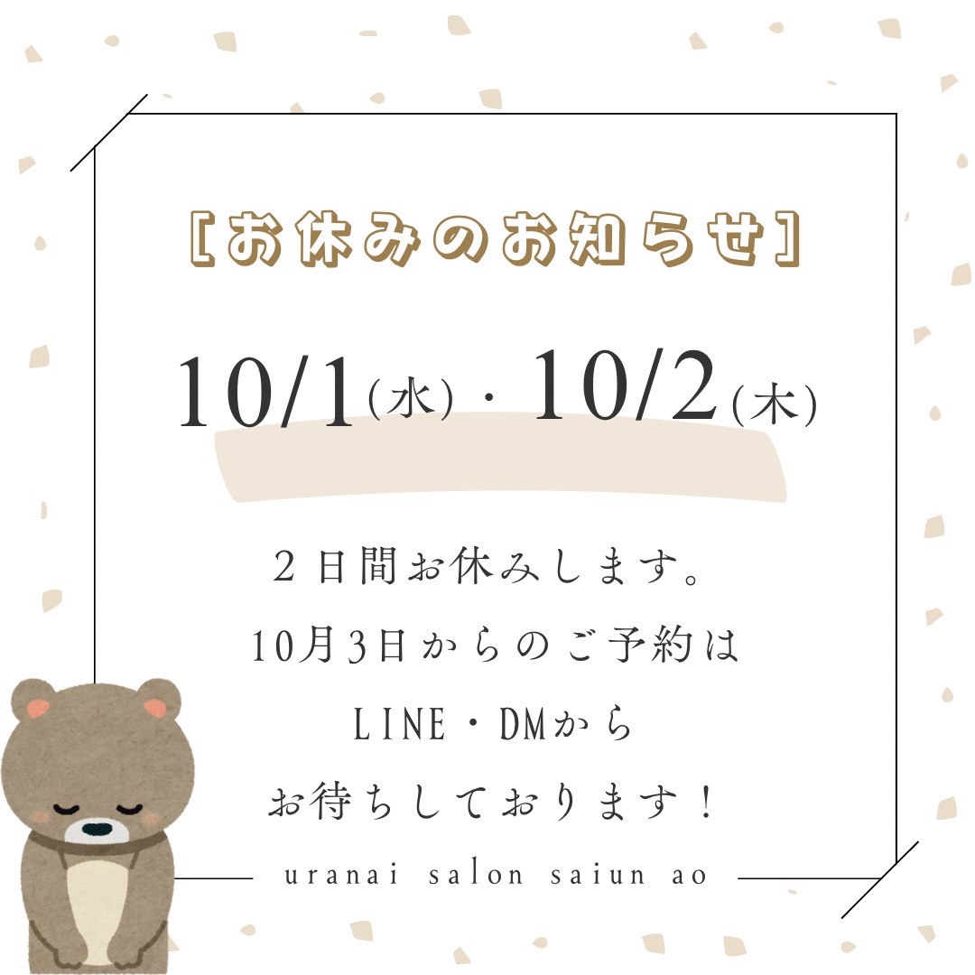 10月2日はお休みをいただきます🙇10月3日からのご予約はDM、LINEより受け付けております🙂↕️